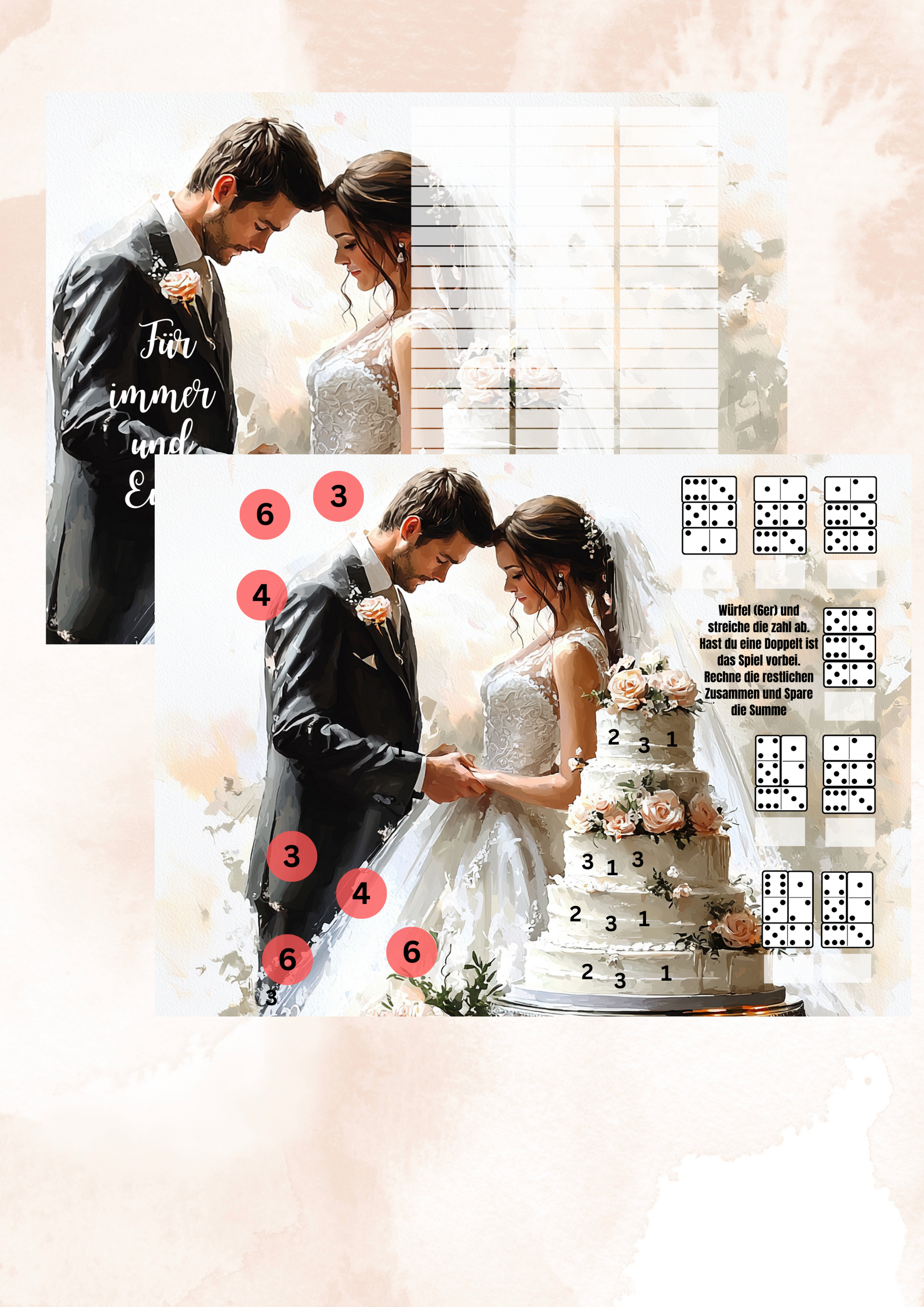The centerpiece is an exciting dice game , combined with scratch-off spaces and little scratch-off moments. This makes saving not only practical, but also playful and full of joy—perfect for lovingly preparing for a special event.