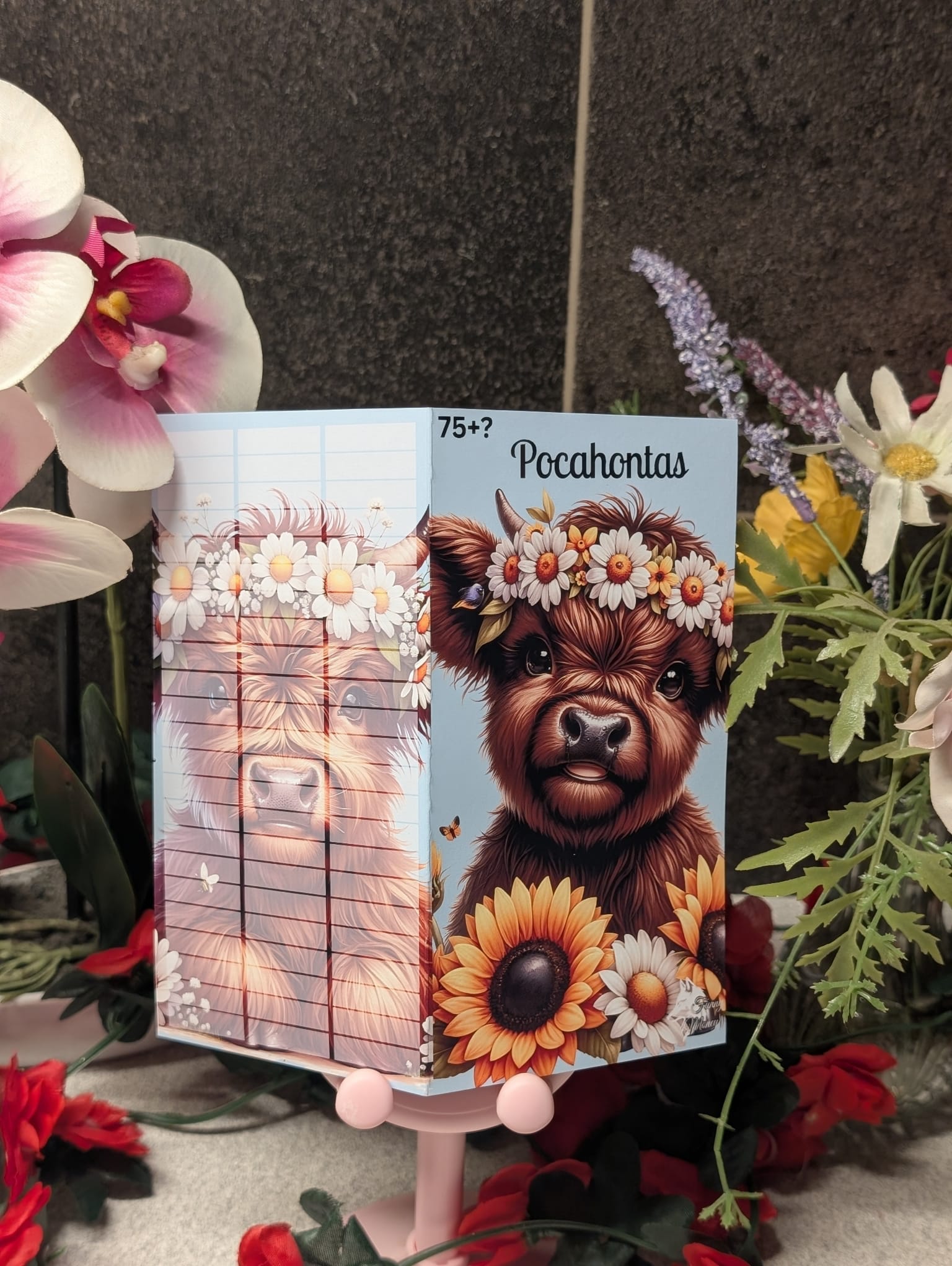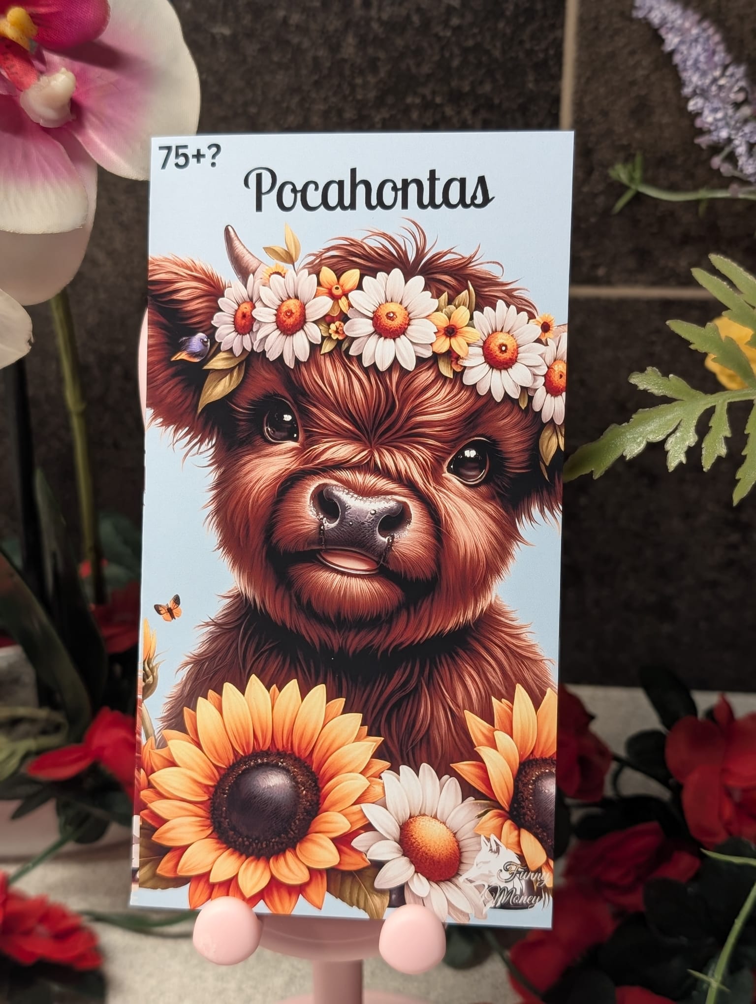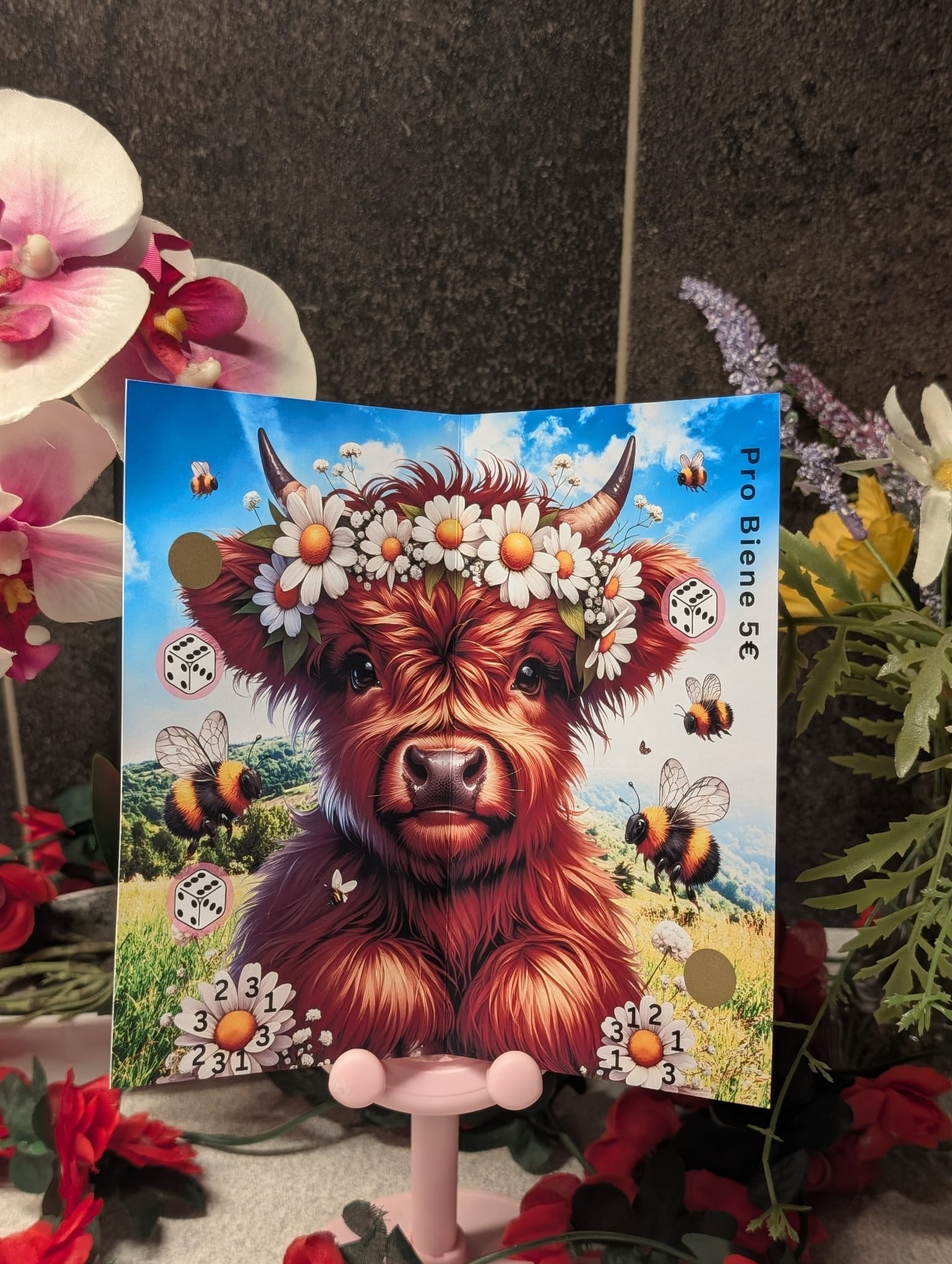 A sweet Highland cow enjoys the summer, surrounded by colorful flowers and busy bees.