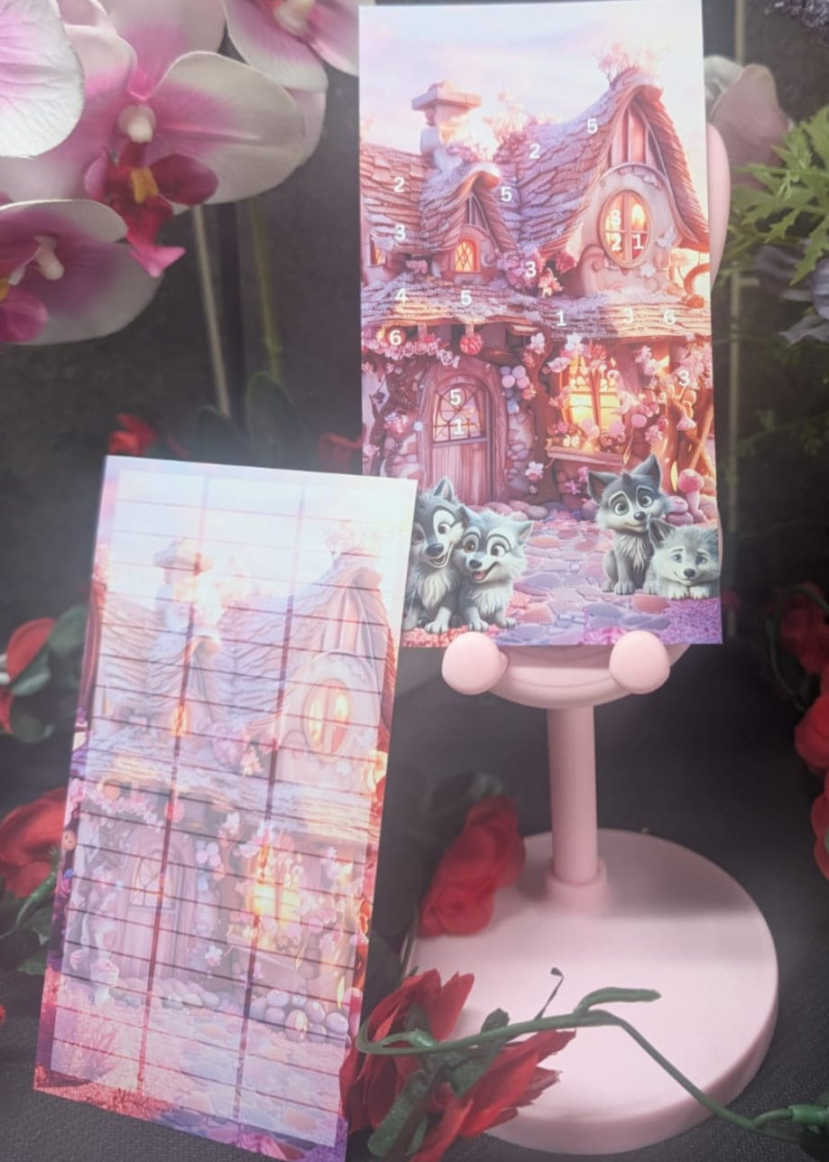 Kleine verspielte Wölfe vor einem rosa Häuschen, auf sanftem Boden und unter einem sonnigen Himmel – ein Motiv voller Leichtigkeit und Magie. 🌞🏡